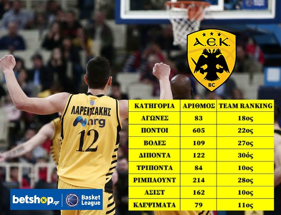 Με αυτούς τους 21 πόντους, ο 25χρονος γκαρντ έγινε ο 22ος παίκτης στην ιστορία της ΑΕΚ στην Betshop Basket League που ξεπέρασε τους 600 πόντους. Διανύοντας την τρίτη σεζόν του με τον Δικέφαλο, ο Λαρεντζάκης έχει αναρριχηθεί στις ιστορικές λίστες της ΑΕΚ στο επαγγελματικό Πρωτάθλημα...
