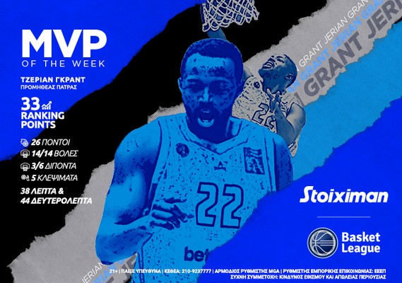 Stoiximan MVP of the Week αναδείχθηκε ο Τζέριαν Γκραντ με εμφάνιση βγαλμένη από το NBA, στο όποιο έχει αγωνιστεί σε 287 αναμετρήσεις στην καριέρα του μέχρι στιγμής!
