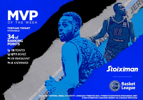 Για δεύτερη σερί εβδομάδα και τρίτη συνολικά στο Πρωτάθλημα της φετινής σεζόν ο Τζέριαν Γκραντ αναδεικνύεται Stoiximan MVP of the Week! Ο 29χρονος Αμερικανός γκαρντ του Προμηθέα είχε κερδίσει τον τίτλο του Πολυτιμότερου την περασμένη εβδομάδα στη νίκη της ομάδας της Πάτρας στο Περιστέρι και με την εμφάνιση του στην εκτός έδρας αναμέτρηση με αντίπαλο το Λαύριο Megabolt για την 12η αγωνιστική της κανονικής περιόδου της Stoiximan Basket League.