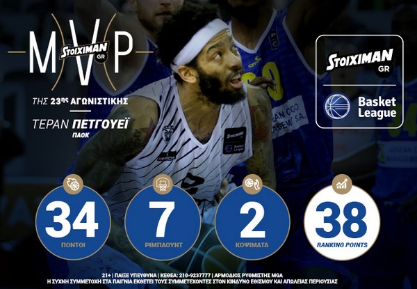 Σπουδαίο... παράσημο χαρακτήρισε ο Τεράν Πέτεγουεϊ την ανάδειξη του σε STOIXIMAN.GR MVP της 23ης αγωνιστικής της κανονικής περιόδου της STOIXIMAN.GR Basket League. Ο 26χρονος Αμερικανός περιφερειακός στην εντός έδρας νίκη του ΠΑΟΚ επί του Λαυρίου Megabolt, που ήταν η έβδομη σερί της ομάδας του, συγκέντρωσε 38 βαθμούς στο ράνκινγκ (34 πόντοι με 7/12 βολές, 9/10 δίποντα, 3/7 τρίποντα, 7 ριμπάουντ, δύο ασίστ, οκτώ κερδισμένα φάουλ, δύο φάουλ εναντίον, ένα κλέψιμο, δύο λάθη σε 33’ και 54’’ συμμετοχής) περισσότερους από κάθε άλλο παίκτη νικήτριας ομάδας στην 23η αγωνιστική.