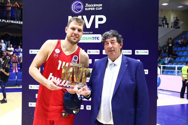 Ο Σάσα Βεζένκοφ παραλαμβάνει το βραβείο του MVP powered by COSMOTE από τον πρόεδρο του ΕΣΑΚΕ κ. Ευάγγελο Γαλατσόπουλο