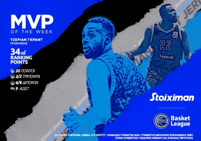 Για δεύτερη φορά στην Stoiximan Basket League της φετινής σεζόν, Stoiximan MVP of the Week αναδεικνύεται ο Τζέριαν Γκραντ! Ο 29χρονος Αμερικανός γκαρντ του Προμηθέα με τις 287 συμμετοχές στο NBA είχε αναδειχθεί Πολυτιμότερος της Εβδομάδας ύστερα από την εκτός έδρας νίκη της ομάδας της Πάτρας επί του Λαυρίου Megabolt για την 12η αγωνιστική της κανονικής περιόδου της Stoiximan Basket League.