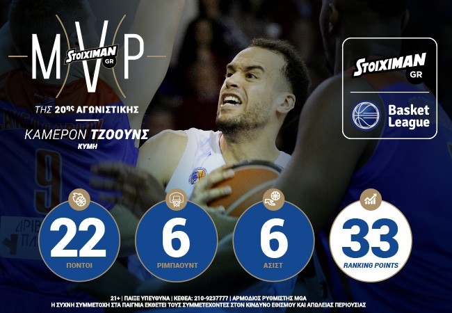 Δύο φορές έχει αναδειχθεί ο Κάμερον Τζόουνς STOIXIMAN.GR MVP της αγωνιστικής. Και τις δύο στις αναμετρήσεις της Κύμης με αντίπαλο τον Πανιώνιο Βίκος Cola! Στην συνάντηση του πρώτου γύρου, στην Νέα Σμύρνη, ο 29χρονος Αμερικανός γκαρντ είχε αναδείχθεί Πολυτιμότερος Παίκτης της αγωνιστικής μαζί με τον συμπαίκτη του στην ομάδα της Εύβοιας, Θάντους ΜακΦάντεν.