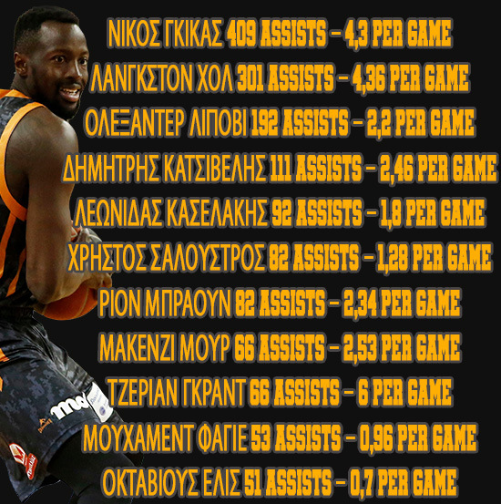 *Παράλληλα με τις τρεις ασίστ που μοίρασε, έγινε ο 8ος πασέρ του Άρη στη Stoiximan Basket League. Έφτασε τις 190 και ξεπέρασε κατά μία τον Βασίλη Ξανθόπουλο που έπαιξε στην ομάδα από το 2015 ως το 2017.
