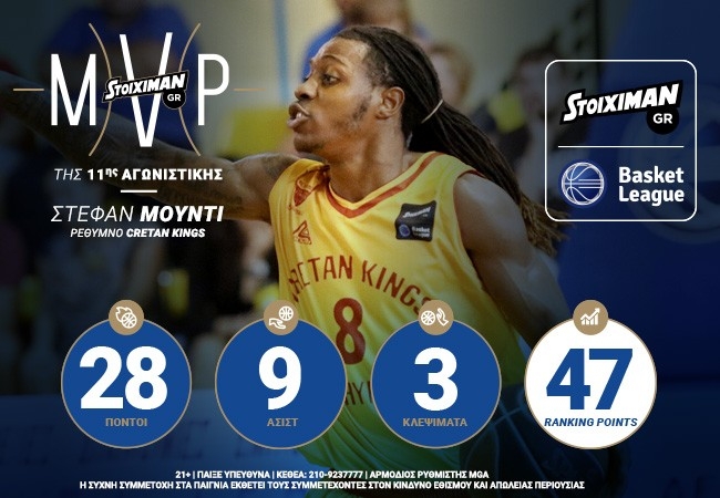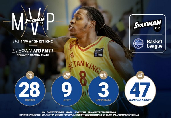 Για δεύτερη σερί αγωνιστική STOIXIMAN.GR MVP αναδεικνύεται παίκτης του Ρεθύμνου Cretan Kings. Την προηγούμενη, 10η, αγωνιστική της κανονικής περιόδου της STOIXIMAN.GR Basket League ήταν ο Σακίλ Γκούντγουιν, την 11η είναι ο Στέφαν Μούντι, ο οποίος στην εκτός έδρας νίκη της κρητικής ομάδας επί των Τρικάλων Bc Aries στην παράταση συγκέντρωσε 47 βαθμούς στο ράνκινγκ (28 πόντοι με 11/13 βολές, 4/4 δίποντα, 3/5 τρίποντα, 2 ριμπάουντ, 9 ασίστ, ένα κόψιμο, 10 κερδισμένα φάουλ, 3 κλεψίματα, 2 λάθη σε 30’ και 28’’ συμμετοχής), περισσότερους από κάθε άλλο παίκτη νικήτριας ομάδας στην αγωνιστική.